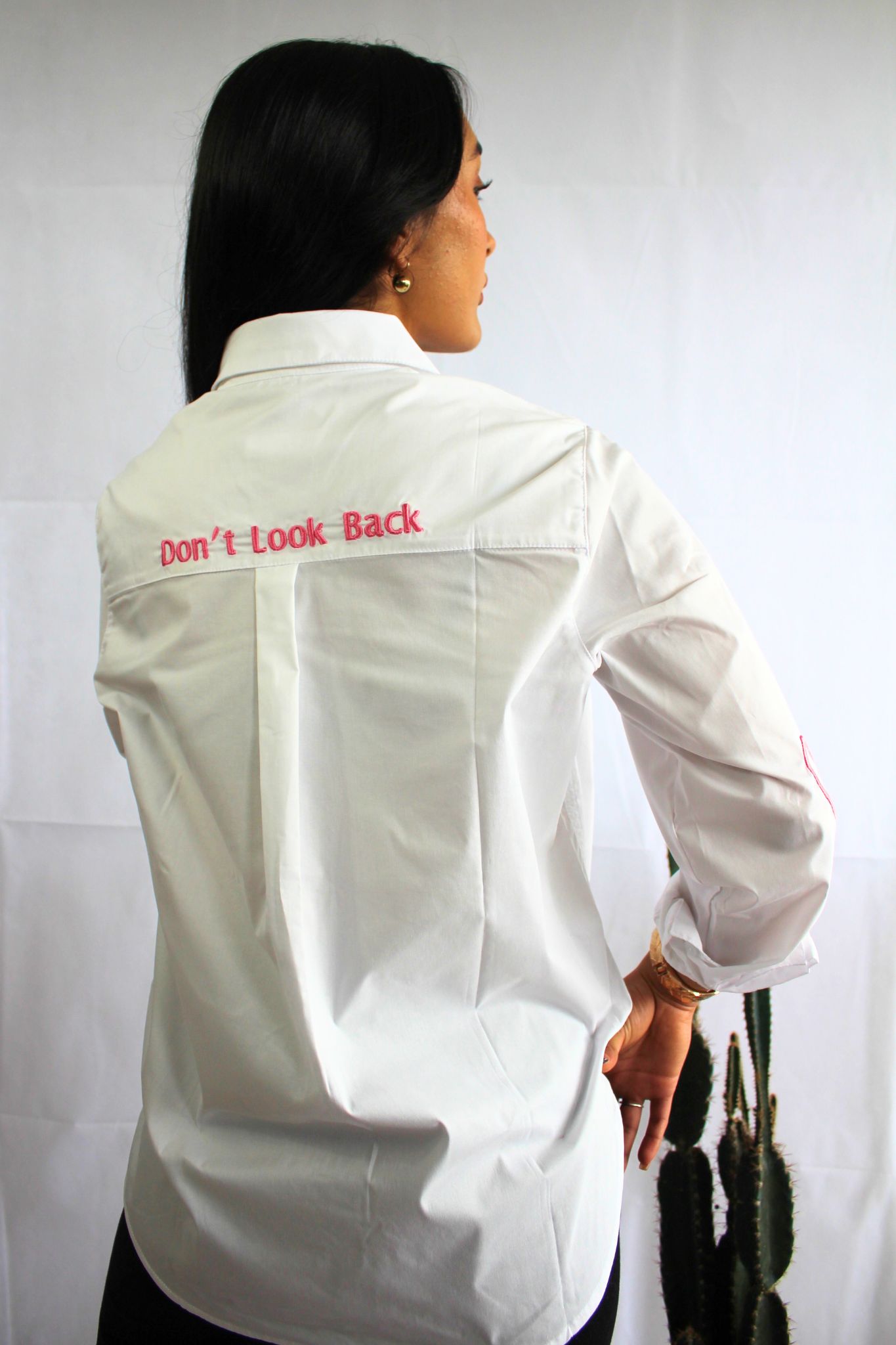 Los detalles bordados son los protagonistas: un corazón en cada codo y en el bolsillo delantero añaden un toque de encanto y romanticismo. En la espalda, un poderoso mensaje bordado, “Don’t Look Back”, te recuerda que el futuro siempre está adelante.