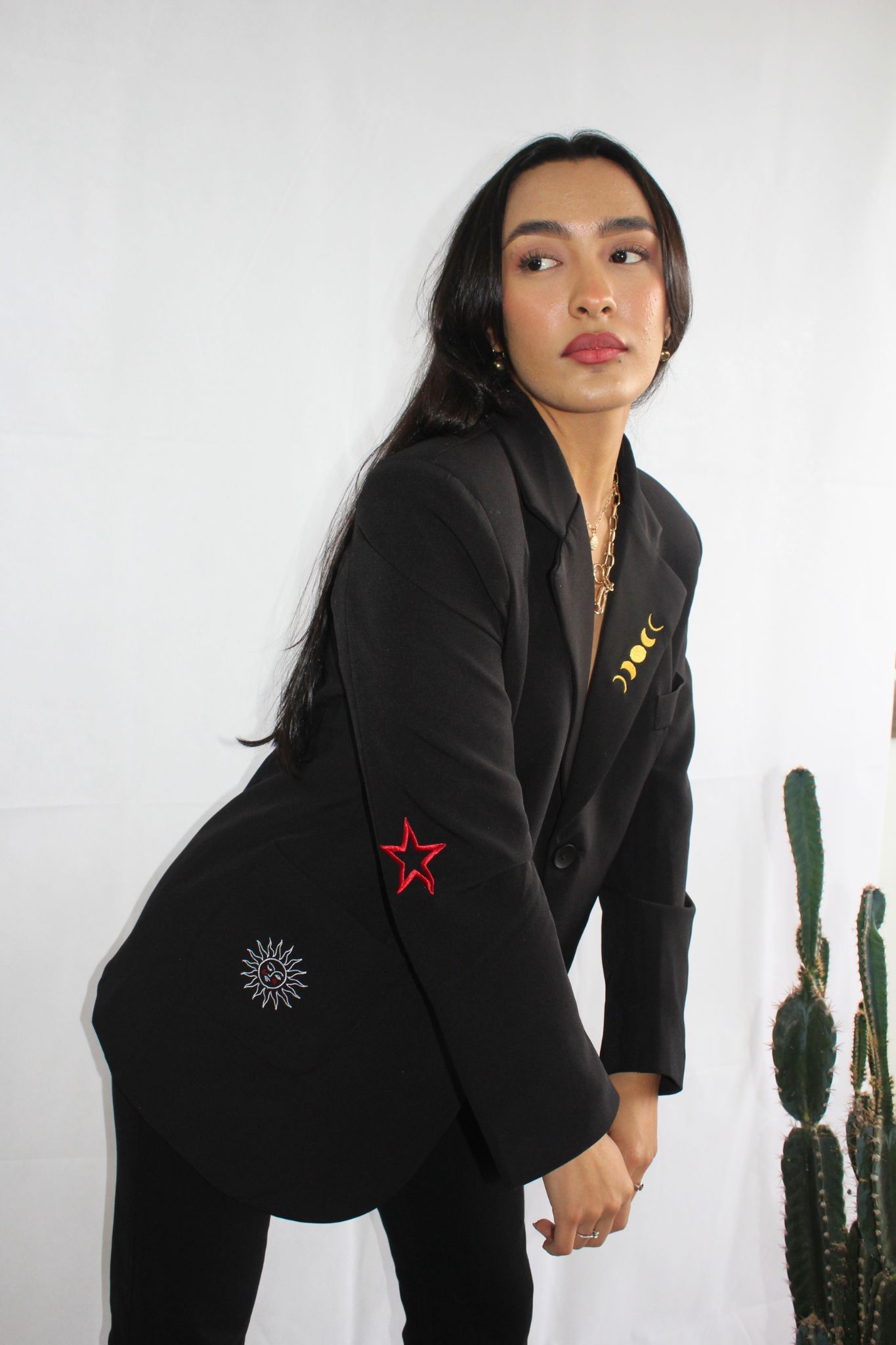 Atrévete a brillar con nuestro blazer “Lunar Magic”, una prenda que combina sofisticación y un toque místico para quienes desean destacarse con estilo. Este elegante blazer negro está confeccionado en un 92% de poliéster y un 8% de spandex, ofreciendo un ajuste perfecto que realza tu figura mientras te mantiene cómoda durante todo el día.